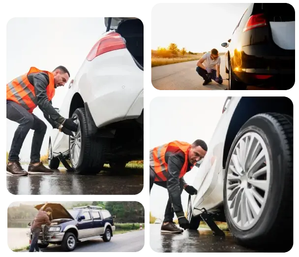 Customers are provided with a list of available services, including towing, battery repair, and tire replacement.